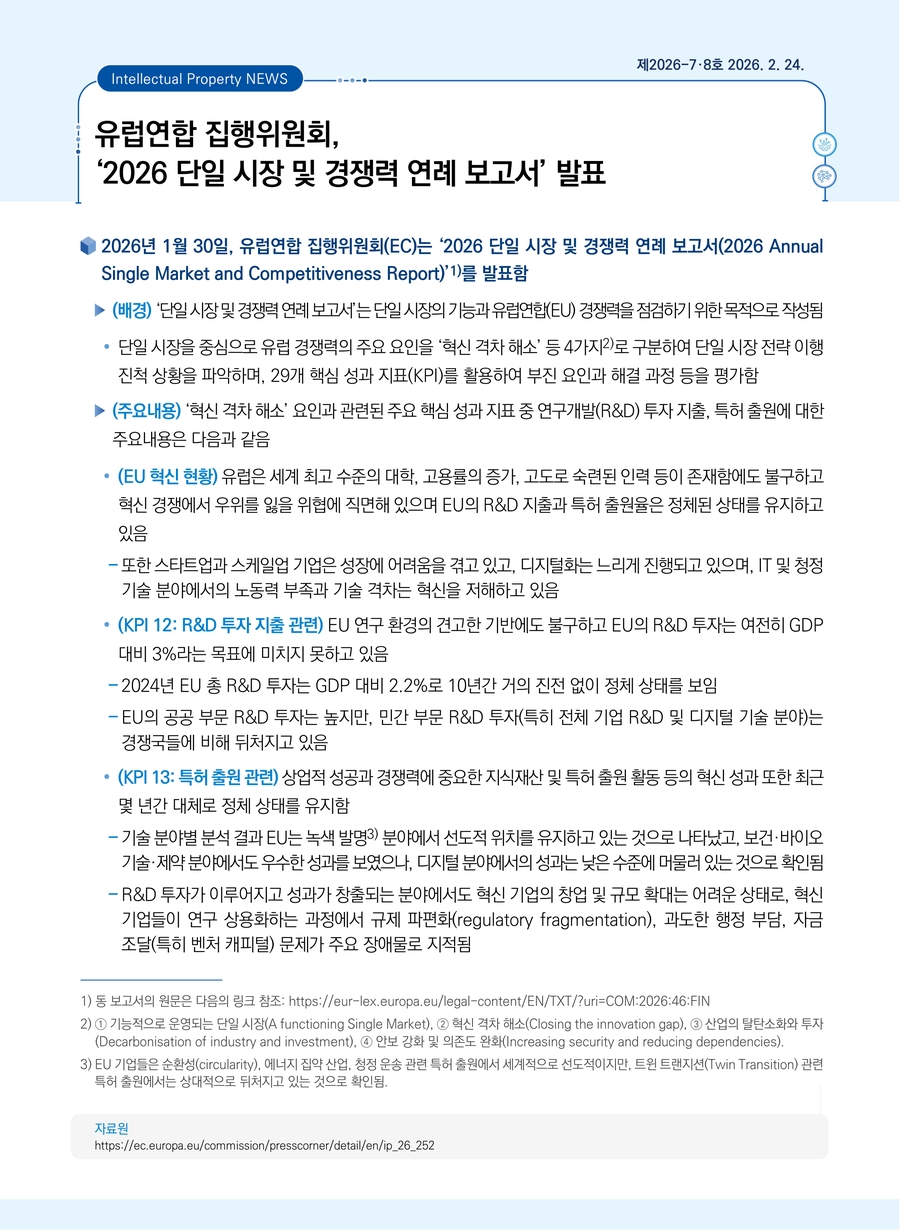 유럽연합 집행위원회, ‘2026 단일 시장 및 경쟁력 연례 보고서’ 발표