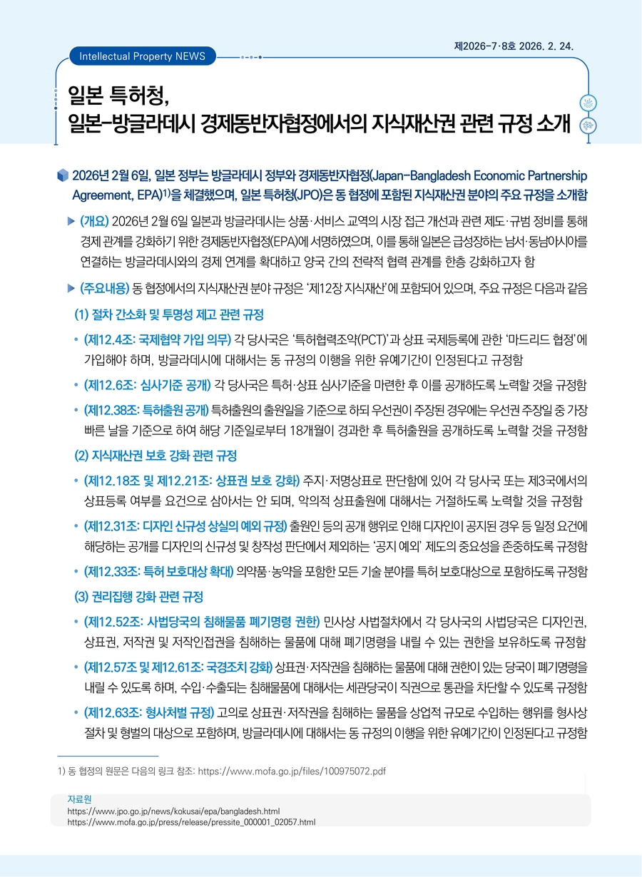 일본 특허청, 일본-방글라데시 경제동반자협정에서의 지식재산권 관련 규정 소개