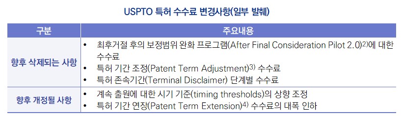 ∙ 2024년 11월 20일, 미국 특허상표청(USPTO)은 2025년 1월 19일부터 특허 수수료를 변경한다는 내용이 담긴 개정된 징수 관련 최종 규칙(final rule)1)을 발표함