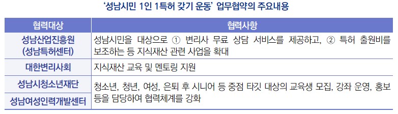 - (주요내용) 동 발표의 주요내용은 다음과 같음 ∙ 성남시장과 성남산업진흥원장, 대한변리사회장, 성남시청소년재단 사업본부장, 성남여성인력개발센터 관장 등은 ‘성남시민 1인 1특허 갖기 운동’ 업무협약식을 개최함 ∙ 성남시는 경기도 31개 시·군 중 중소기업 특허출원 1위 도시로, 지식재산(IP)에 대한 수요와 관심이 매우 높은 도시임 ∙ 이번 협약에 따라 성남시는 지식재산 특화 도시를 위한 정책 개발과 지역 내 협력체계 구축을 본격적으로 추진하고자 하며, 주체별 구체적인 협력사항은 다음과 같음 ![]() - (관련내용) 성남시장은 “창의적인 아이디어를 가진 모든 시민을 잠재적 창업자로 보고, 지식재산 교육, 전문가 멘토링, 특허 권리화 지원 등을 통해 아이디어가 안정적으로 보호받고 성공적인 창업으로 이어질 수 있도록 적극 지원하겠다.”고 강조함 |