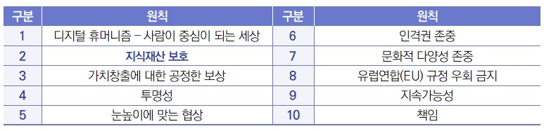 - (주요내용) 동 AI 헌장의 주요내용은 다음과 같음 (1) 개요 ∙ AI 헌장은 창작자의 권리를 존중하고 보호하는 책임감 있는 접근 방식을 위한 일련의 지침임 ∙ GEMA는 AI 헌장을 통해 생성형 AI에 대한 책임 있는 접근 방식과 기술의 기반을 제공한 창작자에 대한 공정한 보상 등의 논의를 촉진하고자 함 ∙ 또한 책임감 있는 방식으로 AI를 활용하는 방법과 디지털 세상에서 인간 창의성의 역할과 관련하여 사회적인 대화를 유도하고자 함 (2) 원칙 ∙ 인간의 창의성과 생성형 AI의 공정하고 지속가능한 발전을 위해 다음과 같이 AI 활용을 위한 10가지 기본 원칙을 정의함 ![]() ∙ 저작권은 창의성, 문화적 다양성, 혁신을 장려하기 위해 창작자가 상업적 이용과 제3자의 무단 저작물 사용으로부터 자유롭고 독립적일 수 있도록 보장하고 법적인 프레임워크 내에서 저작물의 사용을 결정할 수 있는 권리를 부여하고 있는데, AI 헌장의 지식재산 보호 원칙에서는 생성형 AI를 활용하는 경우에도 이러한 개념이 적용되어야 한다는 점을 강조함 1) 동 헌장의 원문은 다음의 링크 참조: https://www.gema.de/documents/d/guest/gema_ai_charter_november_2024-pdf |