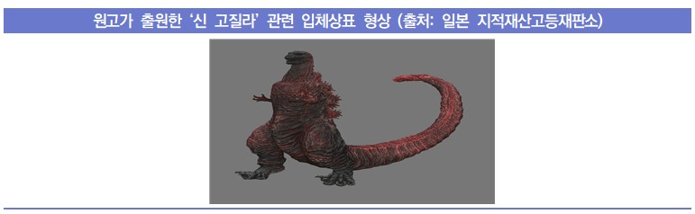 ∙ 2024년 10월 30일, 일본 지적재산고등재판소(知的財産高等裁判所)는 도호社(이하 원고)가 출원한 ‘신 고질라(シン·ゴジラ)’의 형상을 입체상표로서 등록을 인정하지 않은 일본 특허청(JPO, 이하 피고)의 심결을 취소하는 판결을 내림