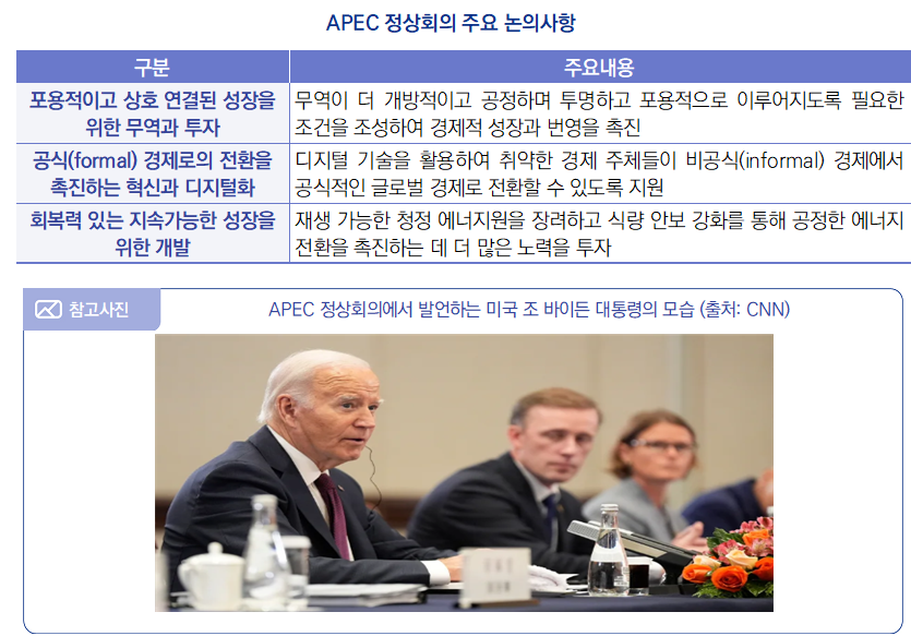 ∙ 2024년 11월 12일, 미국 조 바이든(Joe Boden) 대통령은 백악관(WH)을 떠나기 전 마지막 주요 국제 회의 중 하나로 아시아태평양경제협력체(APEC) 정상회의에 참가할 예정이라고 미국 워싱턴 트레이드 데일리(Washington Trade Daily)가 보도함