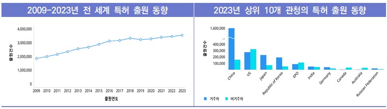 - (개요) 세계지식재산지표는 WIPO에서 매년 발표하는 전 세계 지식재산(IP) 활동에 대한 조사 보고서임 ∙ 2024년 세계지식재산지표는 전 세계 국가 및 지역 특허청과 WIPO의 2023년 출원, 등록 및 갱신 통계를 바탕으로 특허, 실용신안, 상표, 산업디자인, 미생물, 식물 품종 보호 및 지리적표시 현황을 분석함 - (주요내용) 동 보고서의 주요내용은 다음과 같음 (1) 전 세계 특허 출원 동향 ∙ 2023년 전 세계 혁신가들은 전년 대비 2.7% 증가한 약 355만 건의 특허 출원을 기록함 ∙ 전 세계 특허 출원은 코로나19 팬데믹이 한창이던 2019년에 3% 감소한 이후 4년 연속 증가세를 보이고 있음 ∙ 특히 중국(전년 대비 57,830건 증가), 한국(전년 대비 15,628건 증가), 미국(전년 대비 12,682건 증가), 일본(전년 대비 9,040건 증가), 인도(전년 대비 8,734건 증가)에 거주하는 출원인들의 특허 출원이 크게 증가한 것이 2023년 성장의 주요 동력이 됨 (2) 관청별 특허 출원 동향 ∙ 2023년 중국(CNIPA)은 전년 대비 3.6% 증가한 약 168만 건의 특허 출원을 접수하여 1위를 기록했고, 미국(USPTO)은 2위(598,085건), 일본(JPO)은 3위(300,133건), 한국(KIPO)은 4위(243,310건), 유럽(EPO)은 5위(199,429건)를 기록함 ∙ 이 상위 5개 관청의 점유율은 2023년 전 세계 총 점유율의 85%를 차지하며, 10년 전인 2013년의 점유율 보다 4%p가 상승함 ![]() 1) 동 보고서의 원문은 다음의 링크 참조: https://www.wipo.int/edocs/pubdocs/en/wipo-pub-941-2024-en-world-intellectual-property-indicators-2024.pdf |