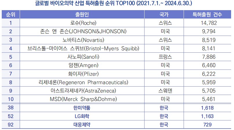 - (개요) 바이오의약 산업은 바이오경제의 중요한 부분으로 바이오기술 산업과 의약 산업으로 구성되어 있으며, 유전공학, 세포공학, 효소공학, 발효공학, 단백질공학 등 현대 바이오기술을 이용하여 인간의 질병 예방, 진단, 치료를 위한 의약품을 생산함 - (주요내용) 동 발표의 주요내용은 다음과 같음 ∙ 글로벌 시장조사·컨설팅업체인 포춘 비즈니스 인사이트(Fortune Business Insights)가 발표한 보고서에 따르면, 글로벌 바이오의약 시장 규모는 2024년 6,169억 4,000만 달러(한화 약 853조 원)에서 2032년 1조 1,837억 2,000만 달러(한화 약 2,542조 원)로 성장할 것으로 예상됨 ∙ IPR Daily는 바이오의약 산업 관련 키워드와 분류번호를 기준으로 2021년 7월 1일부터 2024년 6월 30일까지 전 세계적으로 출원 및 공개된 바이오의약 특허를 집계하여 ‘글로벌 바이오의약산업 특허출원 순위 TOP100’을 발표함 ∙ 로슈는 특허출원 건수 14,782건으로 1위를 차지했고, 존슨 앤 존슨은 9,794건으로 2위를, 노바티스는 8,519건으로 3위를 차지했으며, 한국 기업은 한미약품, LG화학, 대웅제약이 38위, 52위, 92위에 랭크됨
