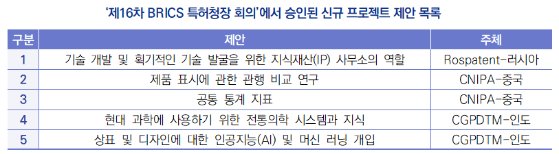 - (배경 및 개요) BRICS는 본래 브라질(Brazil), 러시아(Russia), 인도(India), 중국(China), 남아프리카 공화국(South Africa)의 5개국을 통칭하는 용어였으나, 2024년 1월 1일 에티오피아, 사우디아라비아, 이란, 이집트, 아랍에미리트가 신규 가입하면서 기존 5개국에서 10개국으로 확대됨1) - (주요내용) 동 발표의 주요내용은 다음과 같음 ∙ 제16차 BRICS 특허청장 회의는 2024년 10월 10일부터 10월 11일까지 러시아 모스크바에서 개최됨 ∙ 이번 회의는 BRICS 확대 이후 처음 열리는 공식 특허청장 회의로, 협력 사업의 진행 상황, 인력 확대 후 협력 운영 등의 의제를 논의함 ∙ 구체적으로 CNIPA에서 작성한 ‘BRICS 특허 정보 서비스 보고서(BRICS Patent Information Services Report)’와 다음의 5가지 신규 프로젝트 제안을 승인함 ![]() ∙ CNIPA 션창위 국장은 2024년 BRICS의 지식재산권 협력이 역사적 확장을 이뤄냈으며 이는 협력과 영향력 확대를 위한 새로운 기회를 가져왔다고 강조함 ∙ 또한, 중국은 BRICS 국가들과 지속적으로 교류와 협력을 심화하여 BRICS 국가의 사용자에게 더 나은 지식재산권 보호 환경을 제공하고 각국의 고품질 경제 발전을 지원하기를 희망한다고 밝힘 - (관련내용) 그 밖에도 CNIPA 션창위 국장 및 중국 대표단은 러시아 특허청(Rospatent) 및 유라시아 특허청(EAPO)과 양자회담을 개최하여 지식재산권 전환 및 활용, 인식 제고, 재정 관리, 향후 협력 방안 등의 의제를 교환하고 CNIPA 및 Rospatent 간의 데이터 교환 양해각서를 체결함 1) 2023년 8월 24일, BRICS는 남아프리카공화국 요하네스버그(Johannesburg)에서 개최된 ‘제15차 BRICS 정상회담’에서 에티오피아, 사우디아라비아, 이란, 이집트, 아랍에미리트, 아르헨티나의 신규 회원국 가입을 승인함. 하지만 아르헨티나의 경우, 극우 성향의 밀레이 대통령이 당선된 직후 가입을 철회함(출처: 국제금융센터). |