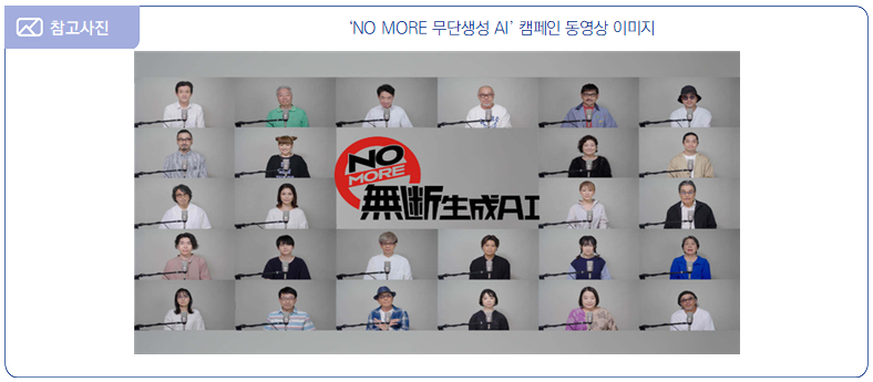 ∙ 2024년 10월 18일, 일본 성우 유지 모임(声優有志の会)은 생성형 인공지능(AI)을 사용하여 무단으로 만들어지는 음성과 영상에 대해 규칙 제정의 필요성을 주장하는 ‘NO MORE 무단생성 AI(NOMORE無断生成AI)’ 캠페인 동영상을 공개했다고 발표함