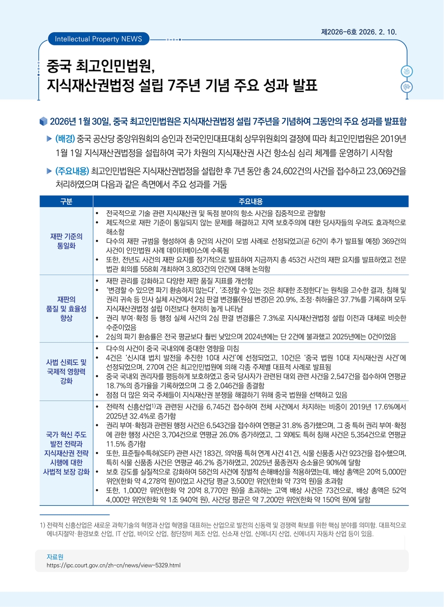 중국 최고인민법원, 지식재산권법정 설립 7주년 기념 주요 성과 발표