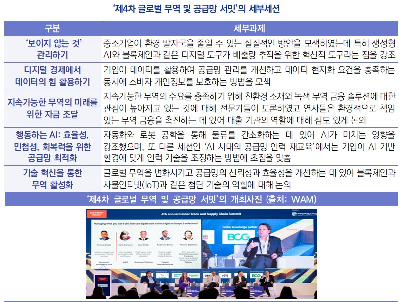 - (주요내용) ’제4차 글로벌 무역 및 공급망 서밋’의 주요내용은 다음과 같음 ∙ (주제) 인공지능(AI) 기술 등을 활용한 공급망의 효율화, 무역과 공급망의 지속가능성을 높이는 기술혁신 도입, 공급망을 강인화하는 선진 기술 도입 등 ∙ (참가) 사우디아라비아, 튀르키예 등 여러 국가에서 약 500명의 기업가와 정부 관계자, 공급망 관련 전문가 ∙ (세부 세션) 제조업, 인프라 관계, 금융, IT 등 다양한 분야의 전문가로부터 AI 기술을 이용한 공급망의 효율화, 강인화, 지속가능성 개선 등의 대처에 대한 견해가 논의되었으며 많은 관계자가 무역이나 공급망 관리로 AI 이용이 크게 진행되는 것을 인정하면서도 아직 문제점도 적지 않다는 점에서 의견이 합치됨