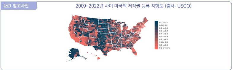 ∙ 2024년 9월 11일, 미국 저작권청(USCO)은 미국 내 저작권 등록의 지리적 분포를 조사한 ‘저작권 등록 지형도(The Geography of Copyright Registrations)’ 보고서1)를 발표함