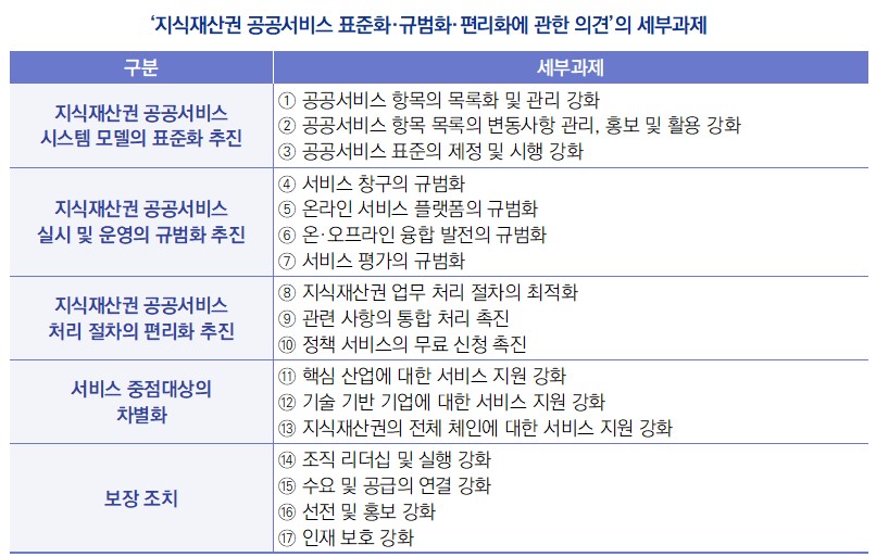 - (주요내용) 동 의견의 주요내용은 다음과 같음 ∙ CNIPA는 2021년 중국 공산당 중앙위원회(中共中央) 및 국무원(国务院)이 발표한 ‘지식재산권 강국 건설 강요(2021-2035년)’2)에 따라 정부 서비스의 효율성 향상 업무를 성실히 이행하고자 함 ∙ 구체적으로 지식재산권 공공서비스의 보편적인 이용을 도모하는 프로젝트를 심층적으로 실시하고 공공서비스의 효율성을 제고하며 지식재산권 공공서비스 관련 업무를 표준화하기 위해 동 의견을 제정함 ∙ 동 의견은 다음과 같이 5가지 측면에서 17가지 세부과제를 제시함 ![]() 1) 国家知识产权局办公室关于推进知识产权公共服务标准化规范化便利化的意见. 동 의견의 원문은 다음의 링크 참조: https://www.gov.cn/zhengce/zhengceku/202409/content_6973462.htm 2) 2021년 9월 22일, 중국 공산당 중앙위원회와 국무원은 지식재산권 강국 건설 추진을 위한 통일된 계획을 수립하고 지식재산권의 창출, 활용, 보호, 관리 및 서비스 수준을 전면적으로 향상시키며 지식재산권 제도가 사회주의 현대화 건설에서 중요한 역할을 발휘할 수 있도록 도모하고자 ‘지식재산권 강국 건설 강요(2021-2035년)(知识产权强国建设纲要(2021-2035年))’를 제정함. 동 강요의 원문은 다음의 링크 참조: https://www.gov.cn/zhengce/2021-09/22/content_5638714.htm