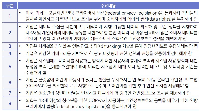 - (배경) 2020년 12월, FTC는 소셜 미디어 및 동영상 스트리밍 서비스를 제공하는 9개2)의 SNS 기업에 개인정보 수집, 사용 및 제공 방식, 광고 및 사용자 참여 관행, 이러한 관행이 어린이와 청소년에게 미치는 영향 등에 대한 데이터를 제공하라는 명령을 내린 바 있음 - (주요내용) 동 보고서는 2020년 12월, FTC의 데이터 제공 명령에 따른 9개 기업들의 응답을 기반으로 작성된 것으로 주요내용은 다음과 같음 (1) 현황 및 문제점 ∙ SNS 기업들이 데이터 브로커의 정보를 비롯해 플랫폼 사용자와 비(非)사용자 모두에 관한 방대한 양의 데이터를 수집하고 무기한 보유할 수 있다는 사실을 발견함 ∙ 많은 SNS 기업이 광범위한 데이터 공유에 관여하고 있는 한편, 이용자의 데이터 취급 관리 및 감독의 적절성에 대한 심각한 우려가 제기됨 ∙ 일부 SNS 기업은 이용자의 삭제 요청이 있는 경우에도 해당 데이터를 삭제하지 않은 것으로 나타나 SNS 기업들의 데이터 수집, 최소화 및 보유 관행이 매우 부적절하다는 결론이 도출됨 ∙ 대다수 SNS 기업들은 타겟 광고를 통해 대부분의 수익을 창출하는 가운데, 수익 창출을 위해 이용자의 데이터를 무분별하게 대량으로 수집하고 있는 것으로 나타났고 이런 무분별한 수집관행이 이용자의 개인정보보호에 위험을 초래할 수 있다고 동 보고서는 지적함 (2) FTC의 권고사항 ∙ FTC는 SNS 기업들의 데이터 관행이 경쟁에 미칠 수 있는 영향을 고려하여 다음과 같이 정책 입안자와 SNS 기업에게 8가지 권고 사항을 제시함 ![]() - (관련내용) FTC 위원장인 리나 M. 칸(Lina M. Khan)은 “동 보고서는 소셜 미디어 및 동영상 스트리밍 회사가 어떻게 엄청난 양의 미국 국민의 개인 데이터를 수집하고 연간 수십억 달러의 수익을 창출하고 있는지를 분석하고 있으며 주(州) 및 연방 정책 입안자들이 악의적인 데이터 관행으로부터 사람들을 보호하기 위한 법안을 고려하고 있는 상황에서 이 보고서의 조사 결과는 시의적절하다.”고 언급함 1) A Look Behind the Screens: Examining the Data Practices of Social Media and Video Streaming Services. 동 보고서의 원문은 다음의 링크 참조: https://www.ftc.gov/system/files/ftc_gov/pdf/Social-Media-6b-Report-9-11-2024.pdf 2) 아마존닷컴(Amazon.com), 바이트댄스(ByteDance), 디스코드(Discord), 페이스북(Facebook), 레딧(Reddit), 스냅(Snap), 트위터(Twitter), 왓츠앱(WhatsApp), 유튜브(YouTube).