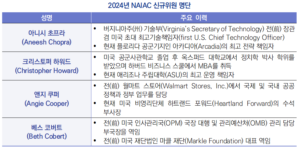 ∙ 2024년 9월 5일, 미국 상무부(DOC)는 인공지능(AI)과 관련된 다양한 문제에 대해 미국 대통령과 백악관(WH)에 자문을 제공하는 ‘국가인공지능자문위원회(National Artificial Intelligence Advisory Committee, NAIAC)’에 4명의 전문가를 신규위원으로 임명한다고 발표함