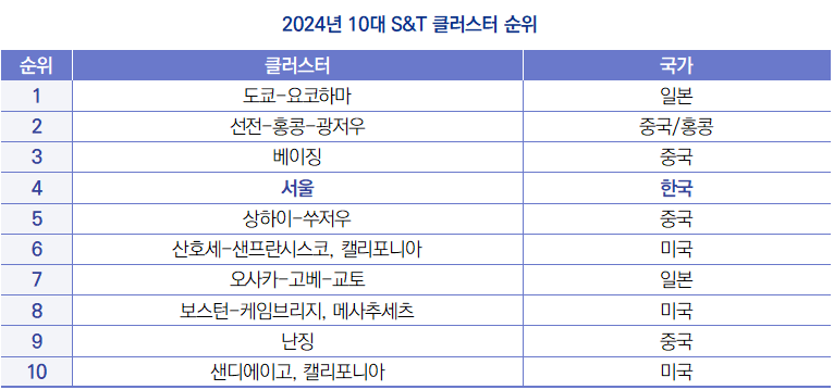 | 세계지식재산기구, 2024년 100대 과학기술(S&T) 클러스터 순위 발표 |