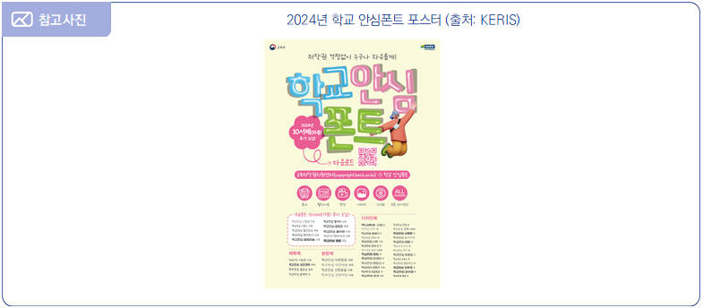 - (주요내용) 동 발표의 주요내용은 다음과 같음 ∙ ‘학교 안심폰트’는 저작권 걱정 없이 사용할 수 있는 교육기관용 오픈 폰트로, KERIS는 매년 공모를 통해 국내 전문기업에서 제작한 폰트 중 학교에서 수요가 높은 폰트를 선정하여 무료로 보급하고 있음 ∙ 2022년 13서체 24종, 2023년 21서체 24종에 이어 2024년에는 10서체 19종이 ‘학교 안심폰트’로 추가됨 ∙ 2024년 신규 폰트는 수업자료, 학급문집, 가정통신문 등에 어울리는 디자인 서체로 학교 현장에서 다용도로 이용할 것으로 기대됨 ∙ ‘학교 안심폰트’와 관련된 저작권 일체는 KERIS가 양도받았으므로, 학교 및 시·도교육청 등은 저작권 걱정 없이 안심하고 자유롭게 이용할 수 있음 ∙ ‘학교 안심폰트’는 KERIS 교육저작권지원센터 누리집(copyright.keris.or.kr)에서 무료로 내려 받아 이용할 수 있으며, ‘학교 안심폰트’를 활용하여 제작된 PPT 형태의 학교 안심템플릿도 함께 제공되어 수업자료 제작, 교내행사 홍보 등에 유용하게 활용할 수 있음 ![]() - (관련내용) KERIS 정제영 원장은 “학교 안심폰트와 학교안심 템플릿 배포로 현장에서 저작권 걱정 없이 수업할 수 있어 뜨거운 반응을 얻고 있다.”고 언급하며 “학교 안심폰트 보급을 통하여 교육기관의 폰트 저작권 분쟁을 예방하고 안전한 저작물 이용 확대를 위해 노력하겠다.”고 밝힘 |