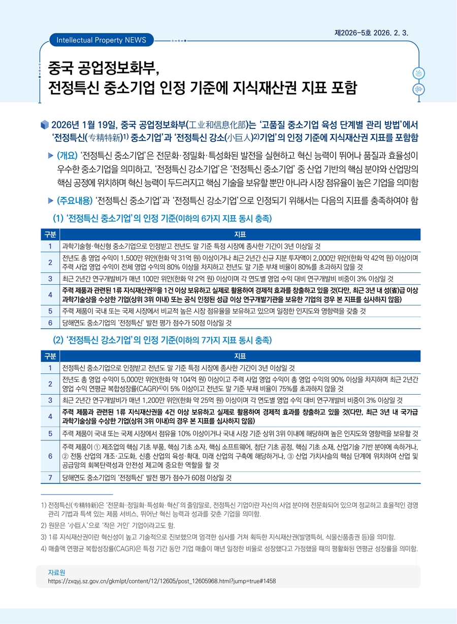 중국 공업정보화부, 전정특신 중소기업 인정 기준에 지식재산권 지표 포함
