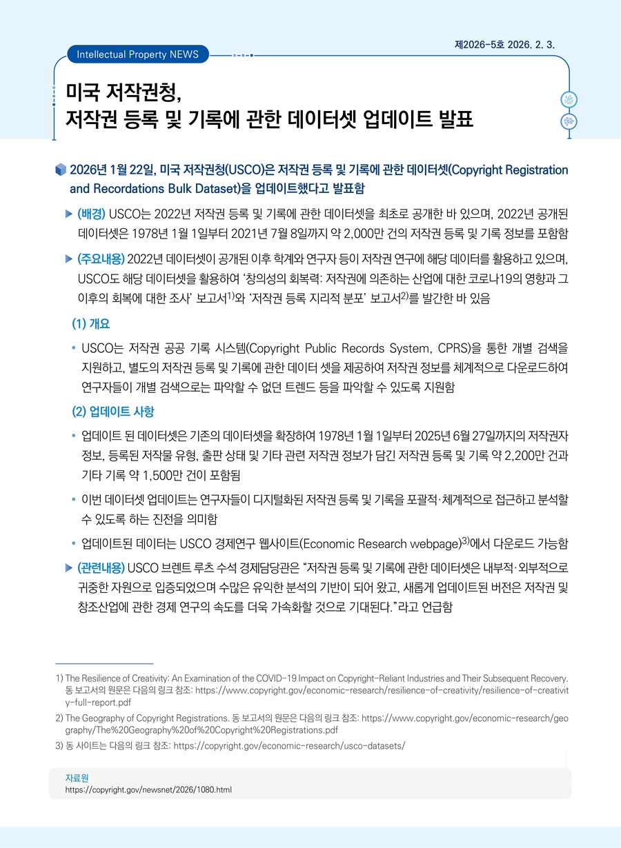 미국 저작권청, 저작권 등록 및 기록에 관한 데이터셋 업데이트 발표
