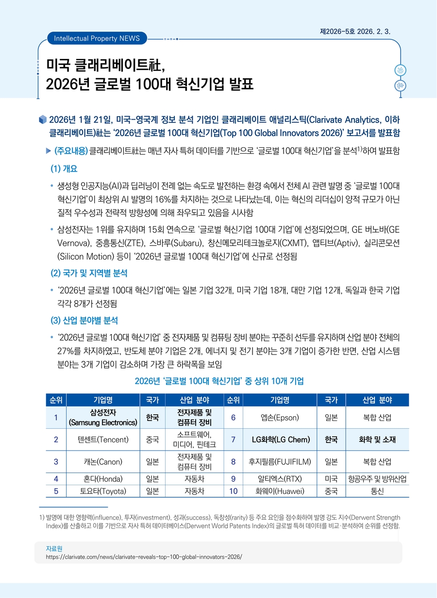 미국 클래리베이트社, 2026년 글로벌 100대 혁신기업 발표