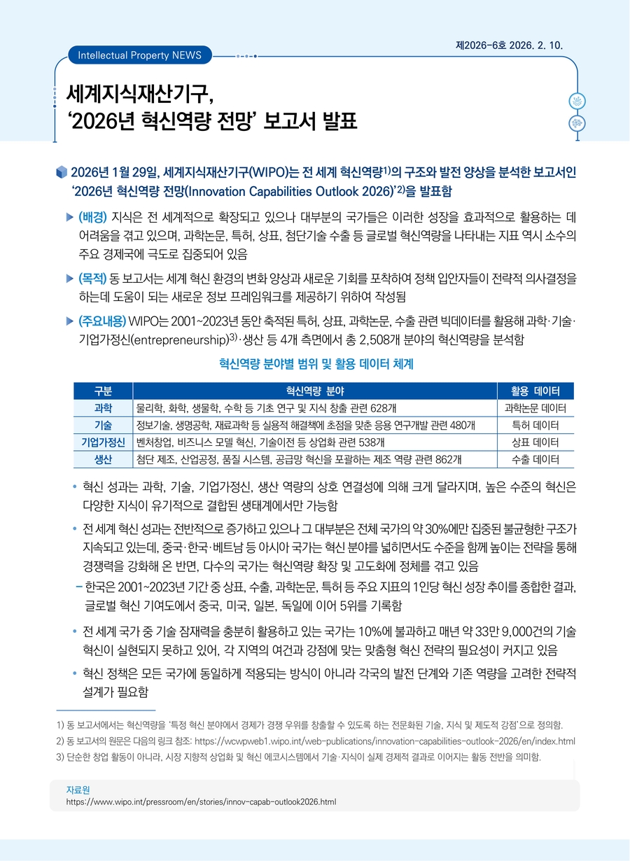세계지식재산기구, ‘2026년 혁신역량 전망’ 보고서 발표