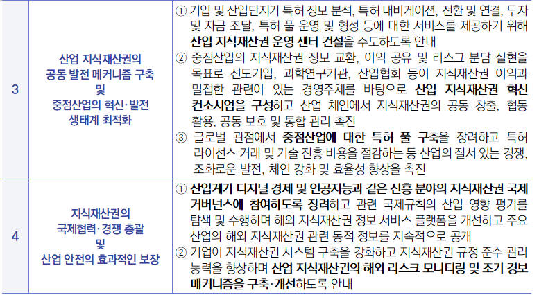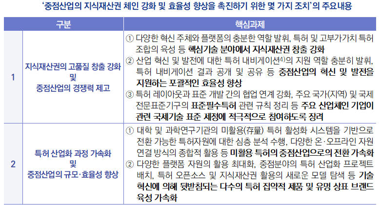 - (배경 및 개요) 중국 시진핑(习近平) 국가주석은 산업 체인을 중심으로 혁신이 전개되어야 한다고 지적하였고, 리창(李强) 총리도 산업 변혁과 고도화에 중점을 두고 특허 전환 및 활용을 위한 특별행동을 적극 시행하여 지식재산권 집약 산업의 발전을 가속화해야 한다고 강조함 ∙ 이러한 업무배치를 반영하여 중점산업의 지식재산권 체인 강화 및 효율성 향상을 효과적으로 추진하기 위해 CNIPA는 8개 부처·기관과 함께 충분한 조사와 광범위한 의견 수렴을 실시해 동 조치를 연구 및 공식화함 - (주요내용) 동 조치는 4가지 측면에서 10가지 핵심과제를 제시함 ![]() ![]() 1) 교육부(教育部), 과학기술부(科技部), 공업정보화부(工业和信息化部), 시장감독관리총국(市场监管总局), 금융감독관리국(金融监管总局), 국무원 국유자산감독관리위원회(国务院国资委), 중국과학원(中国科学院), 중국국제무역촉진위원회(中国贸促会关于印发). 2) 2018년 1월 17일, CNIPA는 ‘지식재산권 중점지원산업 목록(2018년판)(知识产权重点支持产业目录(2018年本))’을 발표하며 현대농업 산업, 차세대 정보기술 산업, 스마트 제조 산업, 신재료 산업, 청정에너지 및 생태환경 산업, 현대교통기술 및 장비 산업, 해양 및 우주 선진적용기술 산업, 선진바이오 산업, 건강 산업, 문화 산업을 10개 중점산업으로 제시한 바 있음. 관련내용은 연구원 ISSUE&FOCUS on IP 제2018-5권호 참조: https://www.kiip.re.kr/board/trend/view.do?bd_gb=trend&bd_cd=1&bd_item=0&po_item_gb=CN&po_no=17408