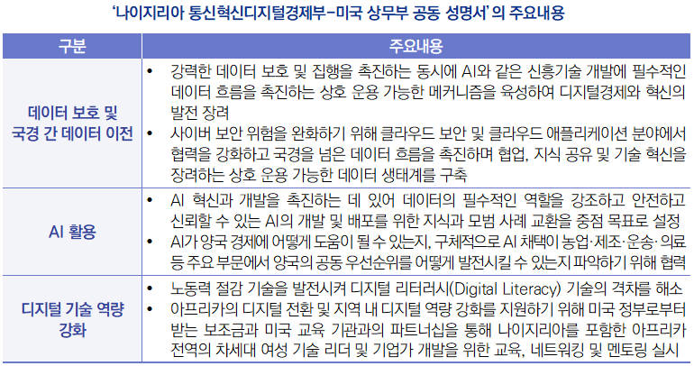∙ 2024년 7월 25일, 나이지리아 통신혁신디지털경제부(Nigerian Ministry of Information, Communication, and the Digital Economy)는 미국 상무부(DOC)와 인공지능(AI) 활용, 데이터 흐름 촉진, 디지털 기술 역량 강화를 위해 협력하는 내용의 공동 성명서(joint statement)를 발표함