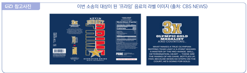 - (주요내용) 동 보도의 주요내용은 다음과 같음 (1) 사건 개요 ∙ 프라임 하이드레이션社는 유명 유튜브 크리에이터 ‘로건 폴(Logan Paul)’ 등이 런칭한 스포츠 음료수 브랜드로 최근 NBA 스타 케빈 듀란트(Kevin Durant)와 제휴하여 만든 ‘프라임(Prime)’ 음료를 판매 중임 ∙ 그 과정에서 프라임 하이드레이션社는 자사 온라인 스토어사이트에 프라임 음료의 광고 문구로 ‘케빈 듀란트 올림픽 프라임 음료’ 라는 설명을 명시함 ∙ 2024년 7월 19일, 미국 올림픽위원회는 콜로라도지방법원(District of Colorado)에 소송을 제기하면서 프라임 하이드레이션社가 자사의 제품 포장과 온라인 광고에 ‘OLYMPIC’, ‘OLYMPIAN’, ‘TEAM USA’, ‘GOING FOR GOLD’ 등의 상표로 등록된 문구를 사용하여 상표권을 침해했다고 주장함 (2) 미국 올림픽위원회의 입장 ∙ 미국 올림픽위원회는 미국 연방 정부로부터 재정 지원을 받지 않고 있으며 미국 올림픽 대표팀 선수들에게 자금을 지원하기 위해 상표권 라이선스에 크게 의존하고 있는 실정임 ∙ 그렇기에 이번 프라임 하이드레이션社의 상표권 침해 행위는 고의적이고 악의적인 의도를 가지고 있으며 대중을 오인하게 수 있고 판매자가 공식적인 연관성이 없음에도 불구하고 올림픽과 특정 브랜드를 연관시켜 상업적 이익을 얻을 수 있음 ∙ 프라임 하이드레이션社에 침해 중단을 요청하며 수백만 달러에 달하는 해당 음료의 판매와 관련된 모든 수익과 위원회의 후원 계약에 따른 피해에 대한 보상을 요구함 ![]() |