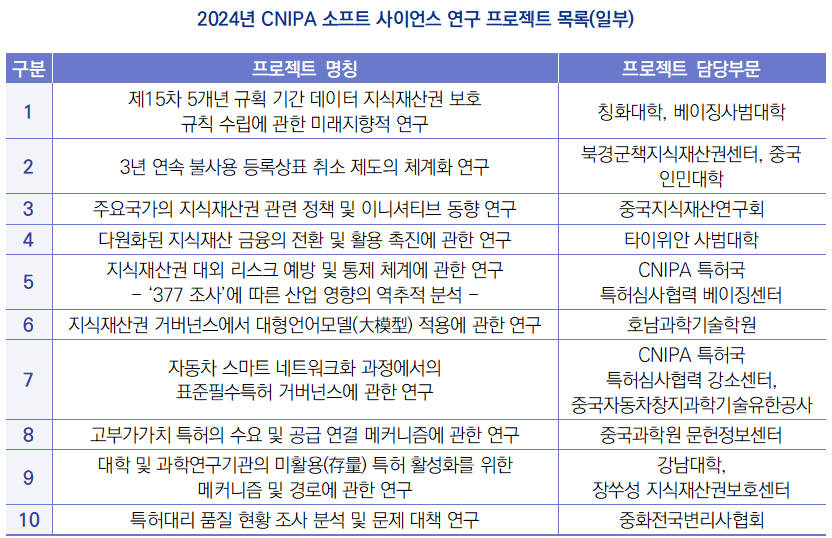 ∙ 2024년 7월 10일, 중국 국가지식산권국(CNIPA)은 2024년 소프트 사이언스1) 연구 프로젝트 목록을 선정 및 발표함