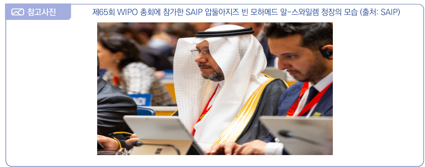 ∙ 2024년 7월 10일, 사우디아라비아 지식재산청(Saudi Authority for Intellectual Property, SAIP)은 제65차 세계지식재산기구(WIPO) 총회에 참가하였다고 발표함