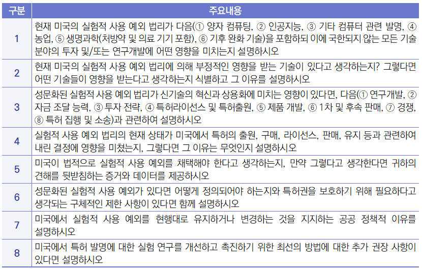 - (배경) 실험적 사용 예외는 특허 존속기간 중 특허권자의 허락 없이 과학적 실험 등의 목적을 위한 특허실시를 허용하여 특허 침해 없이 적절한 활용을 가능하게 해주는 것을 의미하는 개념으로, 미국 특허법은 이를 구체적으로 명시하고 있지는 않지만 관습법상 제한적으로 인정해 옴 ∙ USPTO가 관습법상 실험적 사용 예외를 성문화하려는 시도는 이전에도 존재하였으나 법으로 제정되지는 않았음 - (주요내용) USPTO가 실험적 사용 예외와 관련해 수렴할 의견의 내용은 다음과 같음 ![]() 1) 동 연방관보의 원문은 다음의 링크 참조: https://www.federalregister.gov/documents/2024/06/28/2024-14164/experimental-use-exception-request-for-comments |