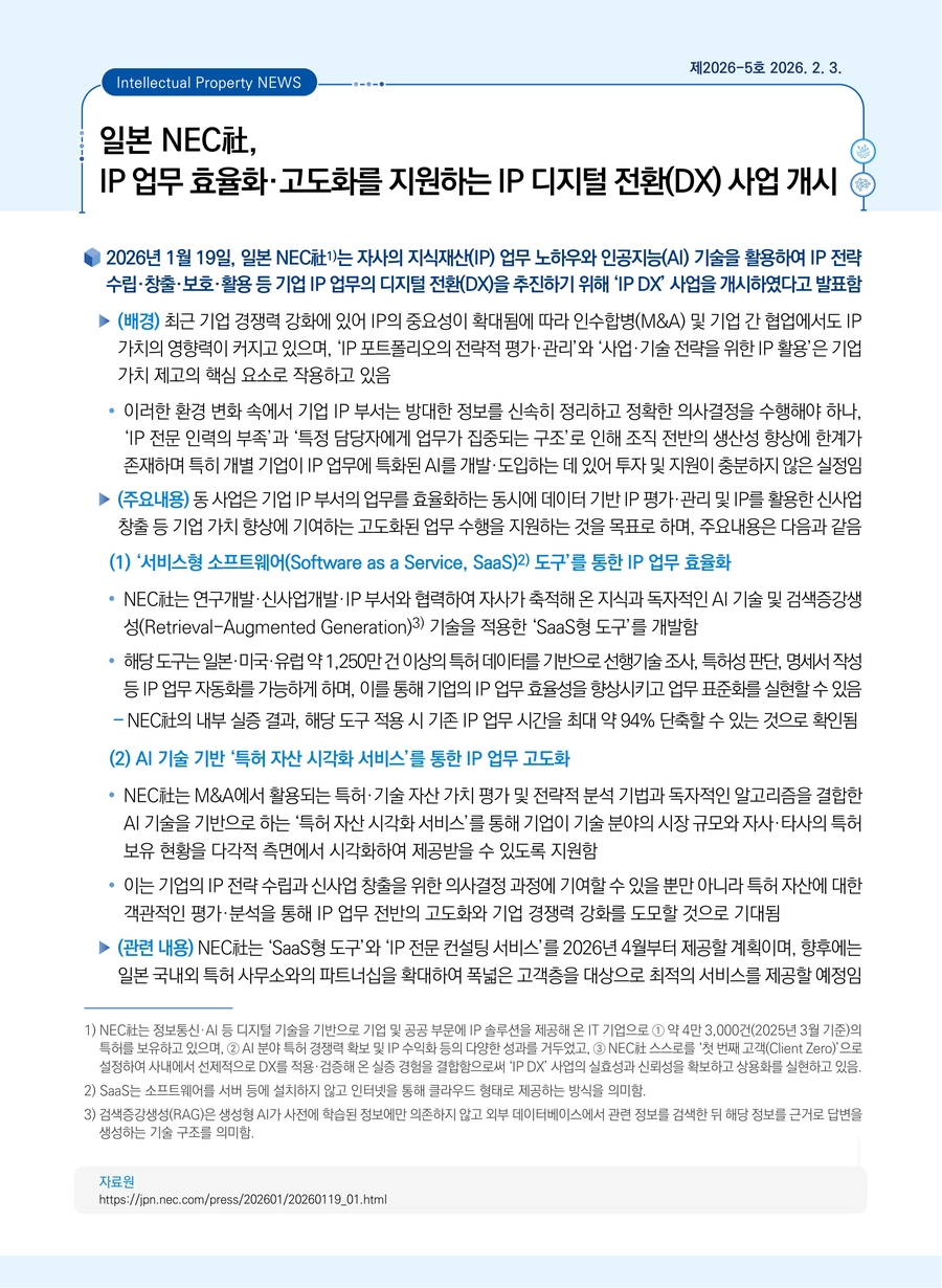 일본 NEC社, IP 업무 효율화·고도화를 지원하는 IP 디지털 전환(DX) 사업 개시