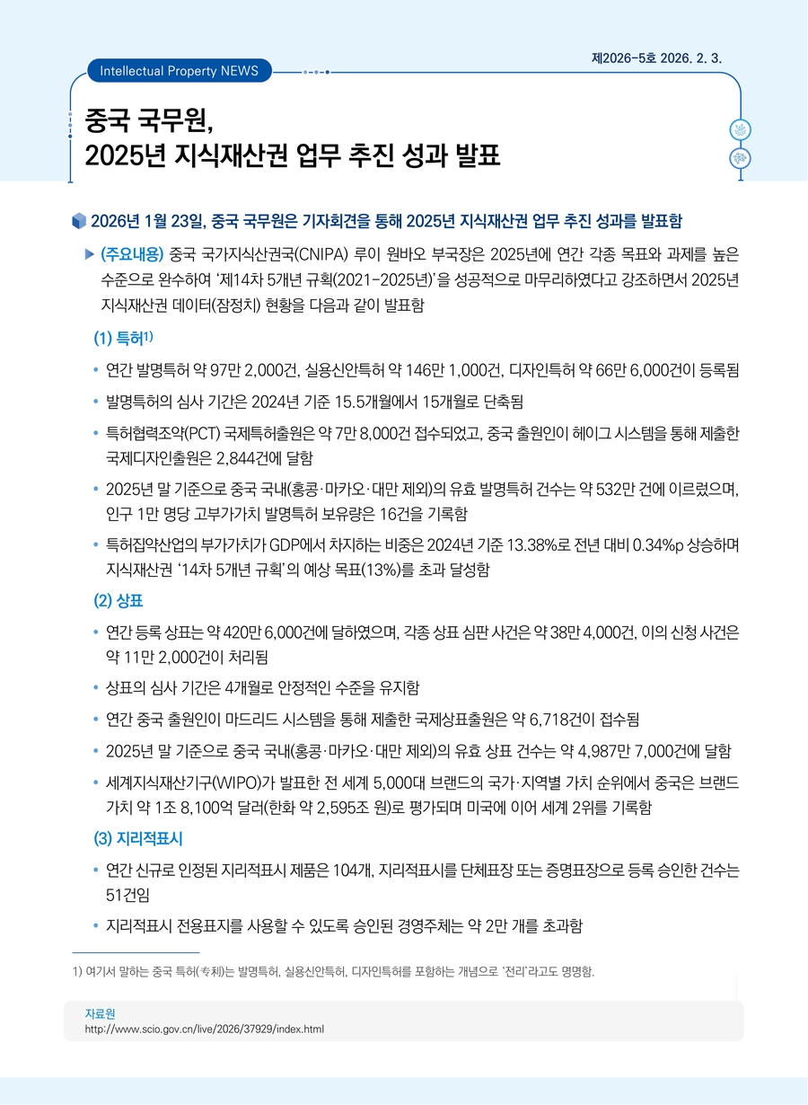 중국 국무원, 2025년 지식재산권 업무 추진 성과 발표