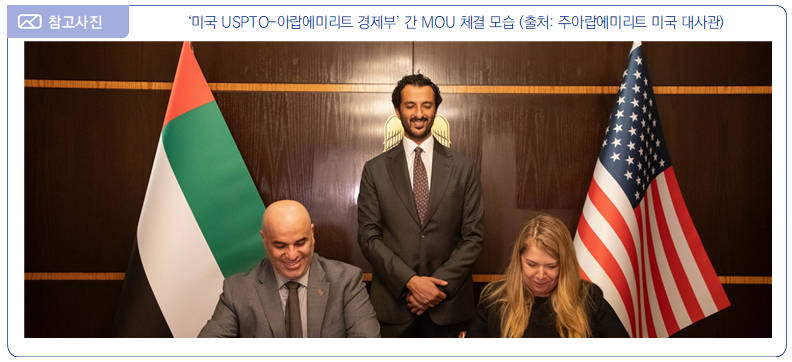 ∙ 2024년 5월 24일, 미국 특허상표청(USPTO)은 아랍에미리트 경제부(UAE Ministry of Economy)와 지식재산(IP) 정책, 시스템, 보호 등에 대한 협력을 강화하기 위해 양해각서(MOU)를 체결하였다고 주아랍에미리트 미국 워싱턴 대사관(Embassy of the United Arab Emirates Washington DC)이 발표함