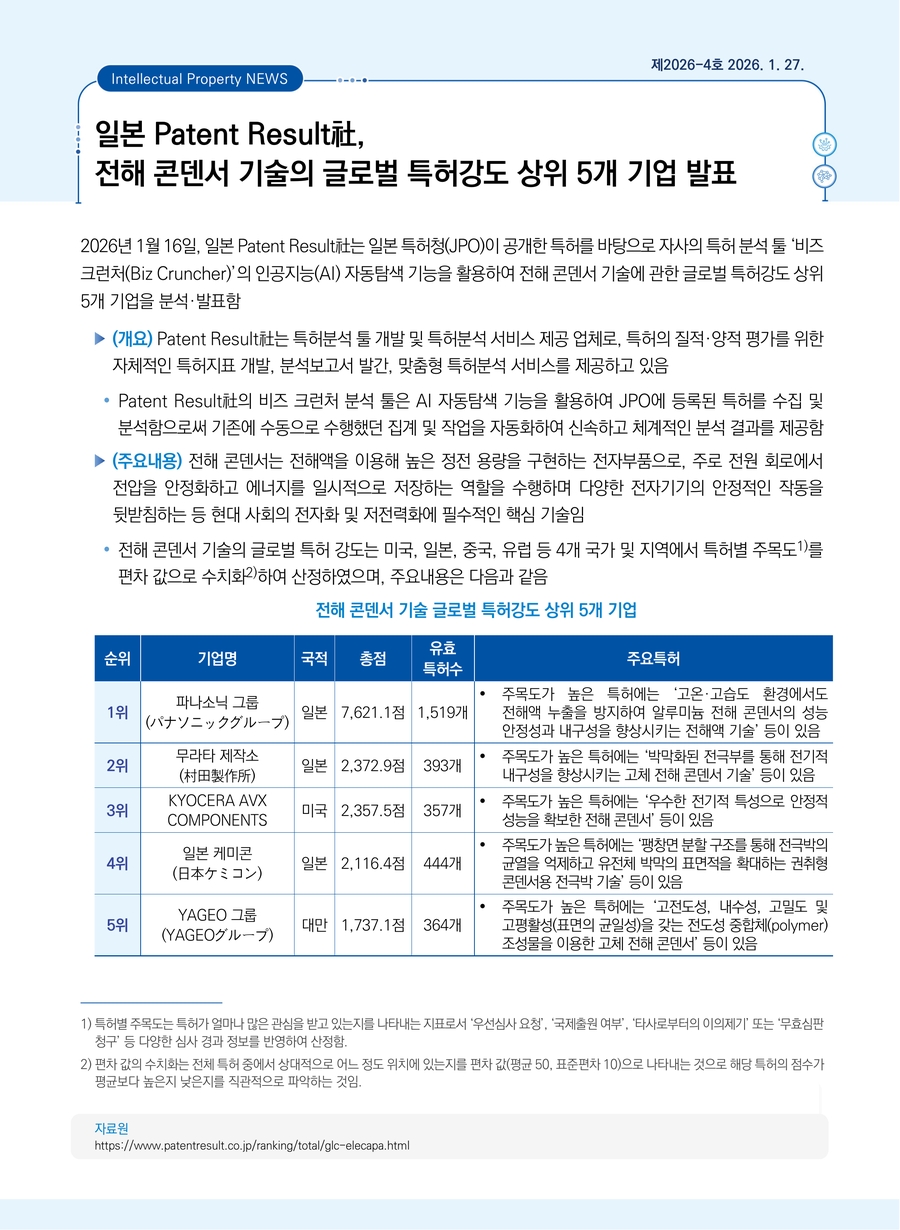 일본 Patent Result社, 전해 콘덴서 기술의 글로벌 특허강도 상위 5개 기업 발표