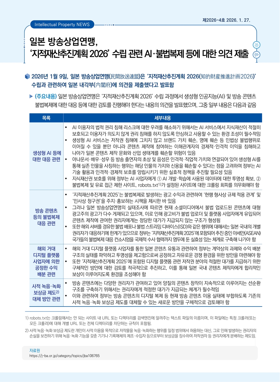 일본 방송상업연맹, ‘지적재산추진계획 2026’ 수립 관련 AI·불법복제 등에 대한 의견 제출