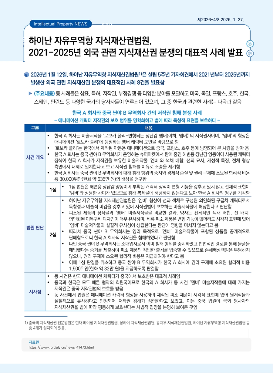 하이난 자유무역항 지식재산권법원, 2021-2025년 외국 관련 지식재산권 분쟁의 대표적 사례 발표