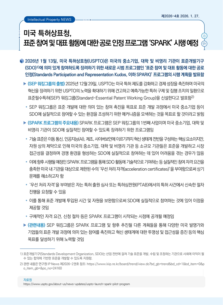 미국 특허상표청, 표준 참여 및 대표 활동에 대한 공로 인정 프로그램 ‘SPARK’ 시행 예정