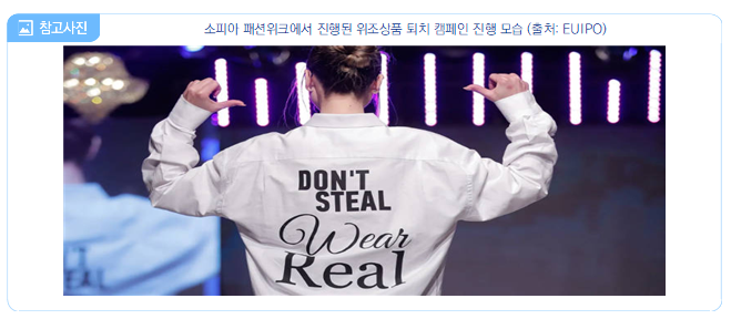 • 2024년 4월 8일, 유럽연합 지식재산청(EUIPO)은 3월 29일에 개최된 소피아 패션위크(Sofia Fashion Week)에서 위조상품 퇴치(Fight Fake) 캠페인을 지원했다고 발표함