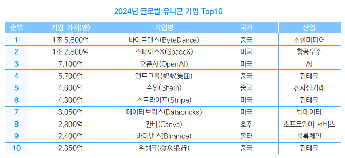 • 2024년 4월 9일, 중국 후룬연구원(胡润研究院)은 2000년 이후 설립되어 기업 가치가 10억 달러(한화 약 1조 3,829억 원) 이상인 전 세계 비상장 기업을 선정한 ‘2024년 글로벌 유니콘(2024全球独角兽榜)’ 리스트1)를 발표함