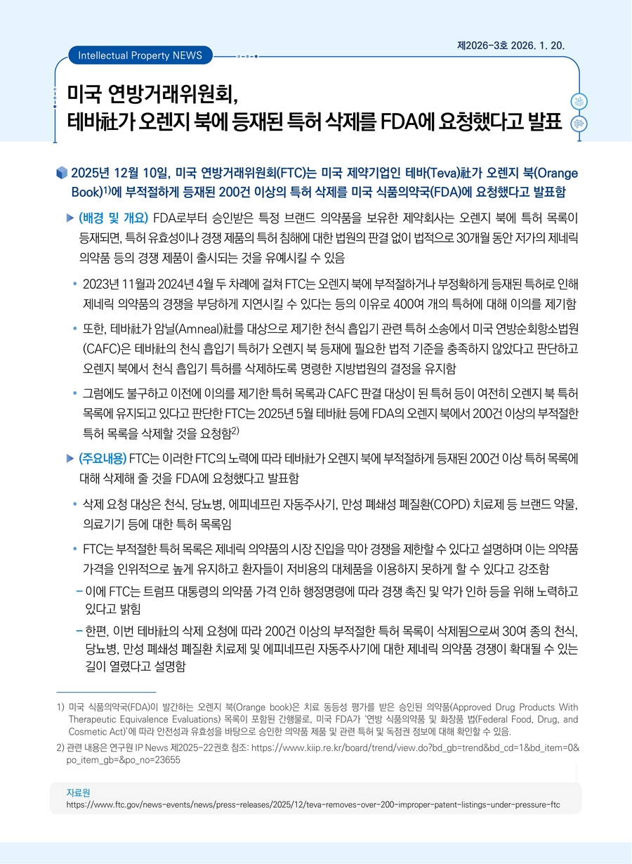 미국 연방거래위원회, 테바社가 오렌지 북에 등재된 특허 삭제를 FDA에 요청했다고 발표