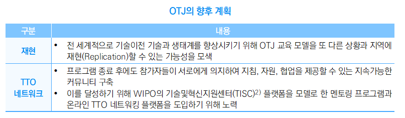 ∙ 2024년 3월 8일, 세계지식재산기구(WIPO)는 남아프리카 연구및혁신관리협회(SARIMA), 남아프리카 국가지식재산관리청(NIPMO), 일본 특허청(JPO)과 협력하여 ‘기술이전 실무 교육 프로그램(Technology Transfer On-the-Job Training Program, OTJ)’을 성공적으로 완료했다고 발표함