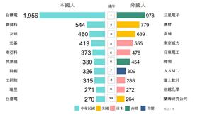 - (주요내용) 동 발표의 주요내용은 다음과 같음 (1) 대만 출원인 ∙ TSMC가 1,956건(대부분 발명특허)으로 8년 연속 1위를 차지함 ∙ 2위(544건)를 차지한 미디어텍(聯發科)과 5위(373건)를 차지한 난야(南亞科)는 역대 최고치를 기록함 ∙ 6위(330건)를 차지한 인벤텍(英業達)은 최근 10년 만에 최고치를 경신했고 연간 14%의 증가율을 기록함 ∙ 10위(270건)를 차지한 델타(台達電)는 최근 15년 만에 최고치를 경신했고 연간 32%의 증가율을 기록함 ∙ 100위권 중 학교는 24개가 포함되었으며, 도시과학대학(城市科大)이 140건으로 4년 연속 1위에 오름 ∙ 100위권 중 연구기관은 3개가 포함되었는데, 산업기술연구원(TIRI)이 315건으로 22년 연속 1위를 기록하였고, 금속센터(金屬中心)가 101건으로 34위를, 섬유연구소(紡研所)가 42건으로 90위를 차지함 (2) 해외 출원인 ∙ 한국의 삼성전자가 978건으로 연간 45% 증가율을 보이며 처음으로 1위에 올랐고 미국 Applied Materials가 779건으로 2위, 미국 퀄컴(QCOM)이 639건으로 3위를 기록함 ∙ 10위권 중 1위의 삼성전자, 4위(555건)의 일본 도쿄일렉트론(TEL), 6위(454건)의 쿠팡, 7위(309건)의 네덜란드 ASML, 10위(264건)의 미국 램리서치(Lam Research)는 모두 역대 최고치를 기록함