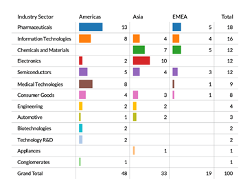 - (주요내용) 이번 발표는 2023년 발간된 렉시스넥시스의 보고서 및 기사에 포함된 데이터를 바탕으로 선정되었으며 주요내용은 다음과 같음 (1) 2023년 혁신 모멘텀 ∙ 렉시스넥시스가 발간한 ‘2023년 혁신 모멘텀(Innovation Momentum)’ 보고서에 따르면 ‘제약, 정보기술, 화학, 전기 및 반도체’ 등 5개의 주요 산업이 혁신을 주도한 것으로 나타남 ∙ 글로벌 Top100에 포함된 대부분의 특허권자는 미국에 본사를 두고 있는 기업으로 확인되었고 아시아 지역의 경우에는 중국, 일본, 한국이 화학 산업뿐만 아니라 전자 분야에서도 전통적인 강세를 지속적으로 보여줌 ∙ 또한 미국, 중국, 프랑스, 독일 및 한국 등 전 세계 국가에서 선도적인 대학 및 기관이 확인되었고 이러한 학계는 여전히 풍부한 혁신의 원천으로 자리매김함