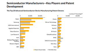 (4) 자율주행 분야 ∙ 지난 10년간 자율주행 분야는 특허의 폭발적인 증대를 반영한 혁신을 확인하였는데, ‘미래의 주행: 자율주행자동차 혁신에 대한 심도 있는 논의’ 보고서에 따르면 바이두는 알파벳, GM, 포드 등 다른 주요 업체를 제치고 자율주행 특허 개발의 확실한 선두주자로 부상하고 있음 ∙ 자율주행 분야의 최고 기업에는 알파벳, 엔비디아, 퀄컴과 같은 기술 회사와 함께 GM, 포드, 도요타 자동차와 같은 전통적인 자동차 제조업체가 혼합되어 있음 (5) 제약 분야 ∙ 주요 제약업체들은 양적 중심의 특허 포트폴리오에서 질적 중심으로 전략적인 전환을 도모하고 있으며 내재적 가치가 더 높은 특허를 목적으로 하고 있음 ∙ 특허 분석을 통해 소규모 제약 회사들 사이에서 새롭게 부상하는 기업을 식별할 수 있으며, 여기에는 아쿠이타스 테라퓨틱스(Acuitas Therapeutics), 이뮨 센서 테라퓨틱스(ImmuneSensor Therapeutic) 및 레거 테라퓨틱스(Regor Therapeutics)와 같은 회사들이 대표적임 (6) 게임 산업 ∙ 렉시스넥시스는 자사의 특허 분석 기법을 활용하여 지난 10년 동안 게임 산업분야의 발명 및 혁신을 검토하였는데, 전체적으로 일본 사행성(파칭코) 업계의 지배력은 두드러졌고 비디오 게임 및 서구의 사행성 업체들이 25위권을 돌파한 사례는 거의 없었다고 밝힘 ∙ 다만, 소니 및 일부 파칭코 기업을 제외하고 대부분의 게임 회사들의 혁신 품질은 감소하는 추세인 것으로 확인되었고 반면 서구 기업들은 더 많은 지역에 투자하여 시장 범위의 확대를 도모하는 등 더 많은 글로벌 혁신에 기여하는 것으로 파악됨 (7) 반도체 분야 ∙ 인공지능(AI) 혁명을 주도하는 상위 20개 반도체 제조업체에는 반도체 순수제조업체, 삼성 및 인텔과 같은 하이브리드 제조업체, ASM International 및 Applied Materials와 같은 장비 공급업체, 웨스턴 디지털 및 인피니온과 같은 통합 장치 제조업체(IDM)가 포함됨 ∙ TSMC(Taiwan Semiconductor Manufacturing Company)는 특허 자산 지수(Patent Asset Index)로 측정한 최대 및 최고 특허 포트폴리오를 보이며 선진 제조 분야에서 1위를 차지하였고 삼성은 2위를 기록함