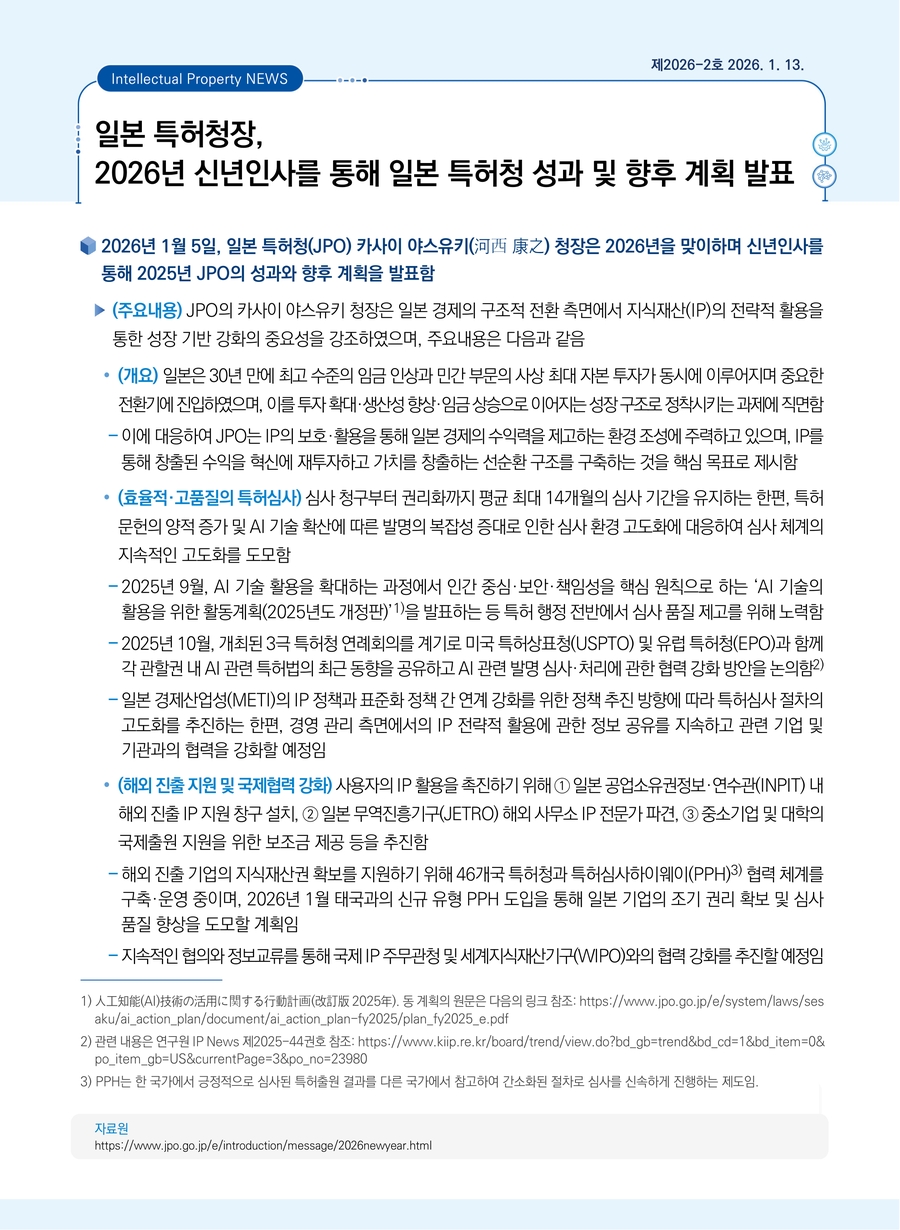 일본 특허청장, 2026년 신년인사를 통해 일본 특허청 성과 및 향후 계획 발표