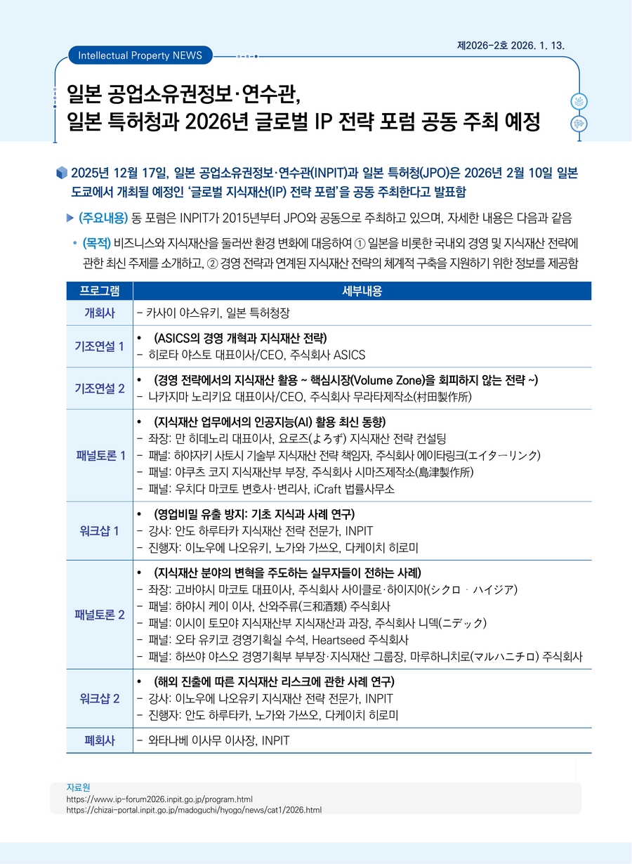 일본 공업소유권정보·연수관, 일본 특허청과 2026년 글로벌 IP 전략 포럼 공동 주최 예정