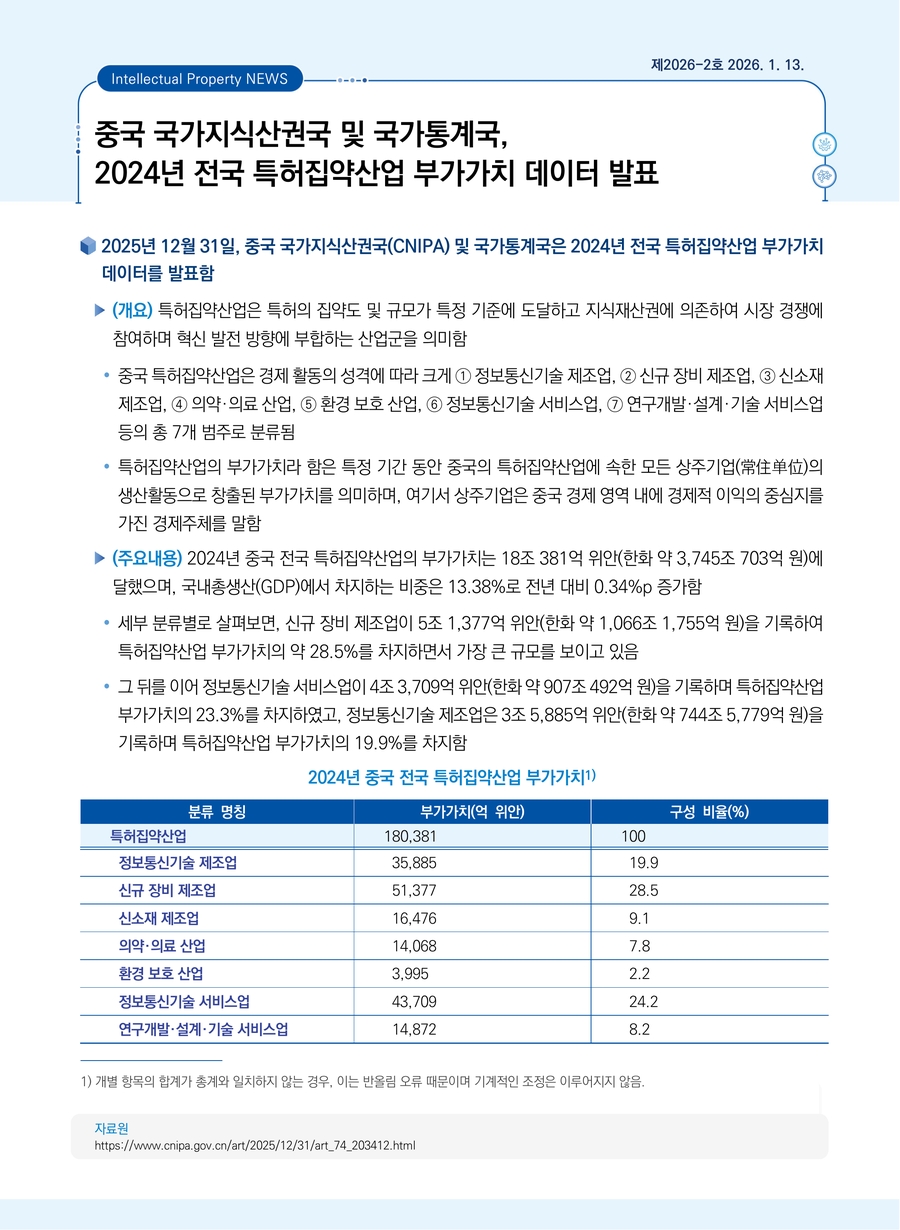 중국 국가지식산권국 및 국가통계국, 2024년 전국 특허집약산업 부가가치 데이터 발표