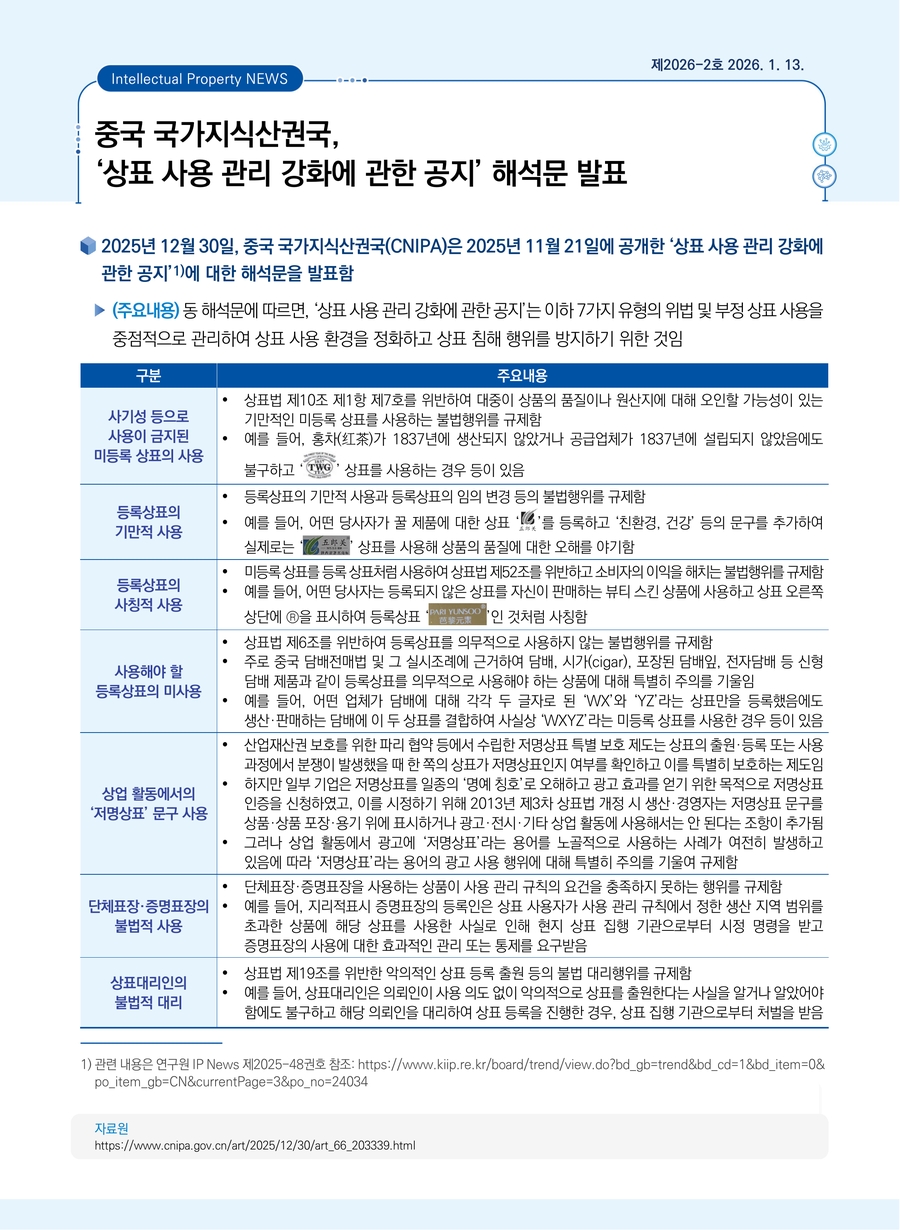 중국 국가지식산권국, ‘상표 사용 관리 강화에 관한 공지’ 해석문 발표