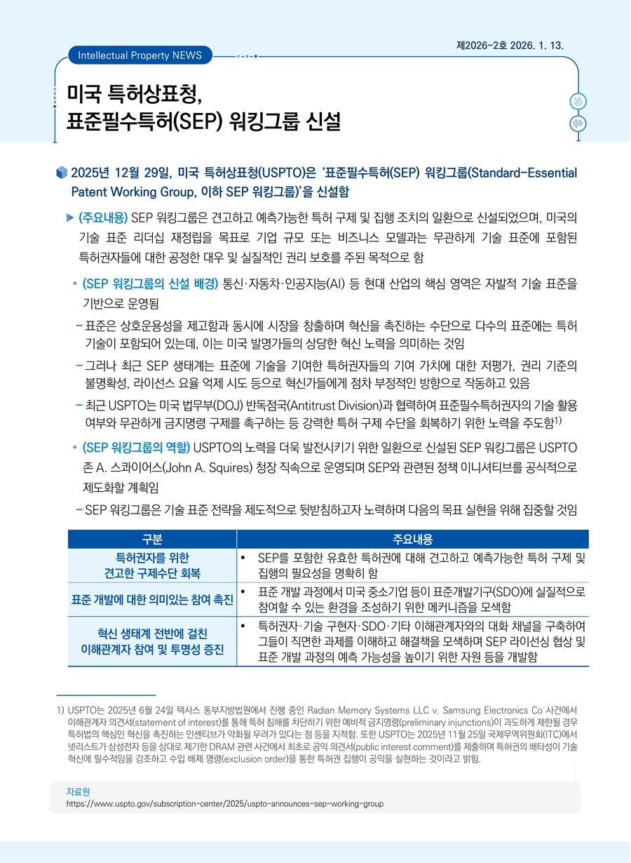미국 특허상표청, 표준필수특허(SEP) 워킹그룹 신설