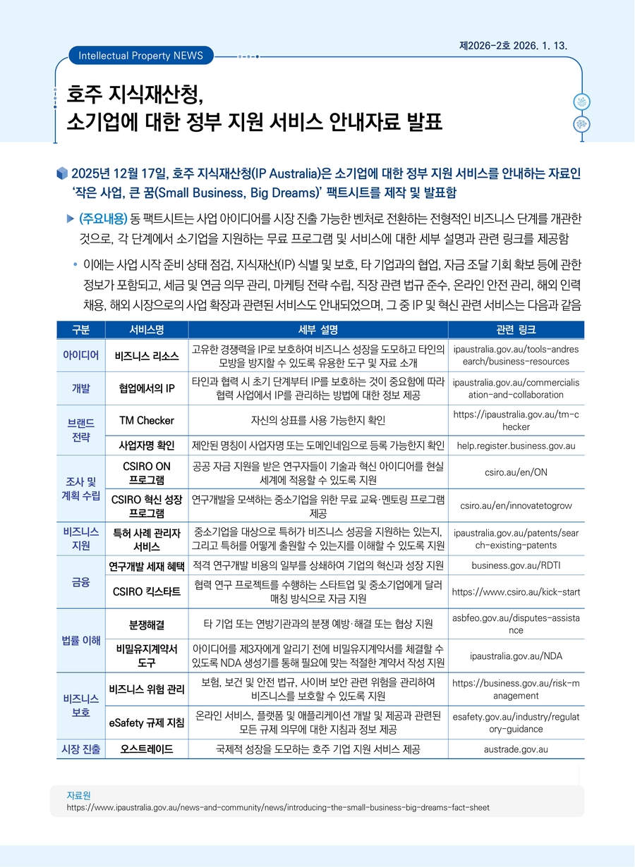 호주 지식재산청, 소기업에 대한 정부 지원 서비스 안내자료 발표