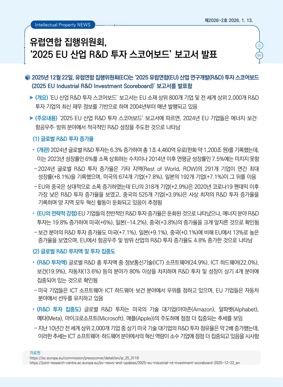 유럽연합 집행위원회, ‘2025 EU 산업 R&D 투자 스코어보드’ 보고서 발표